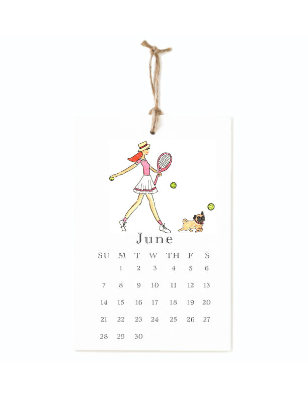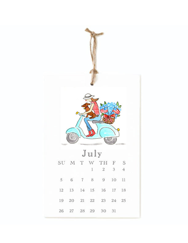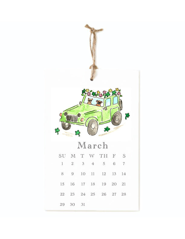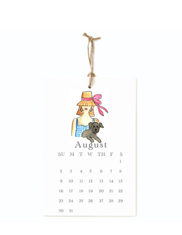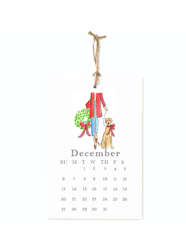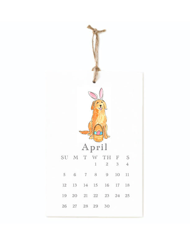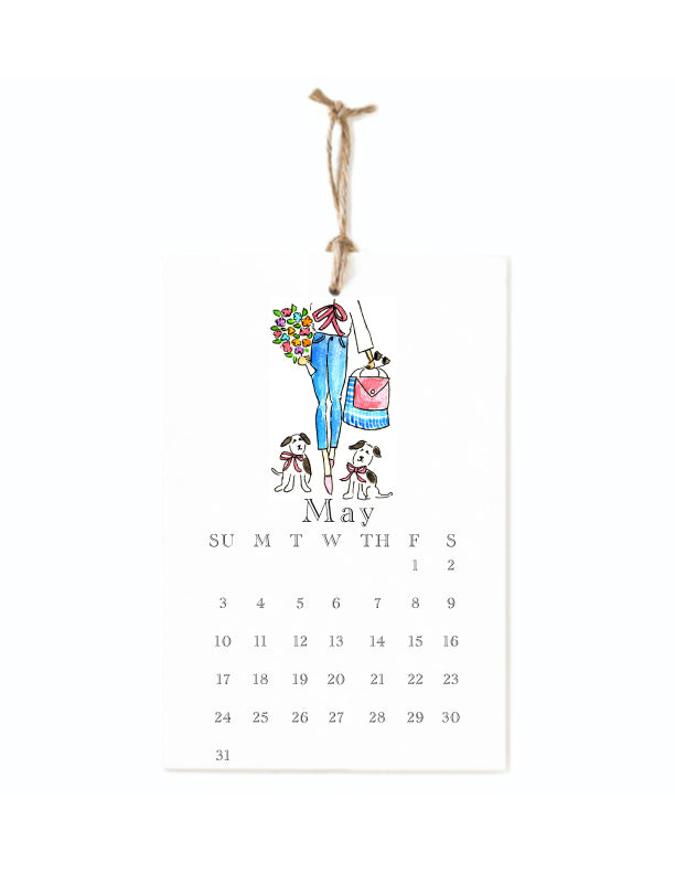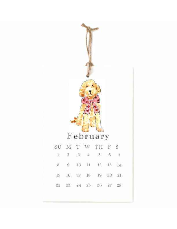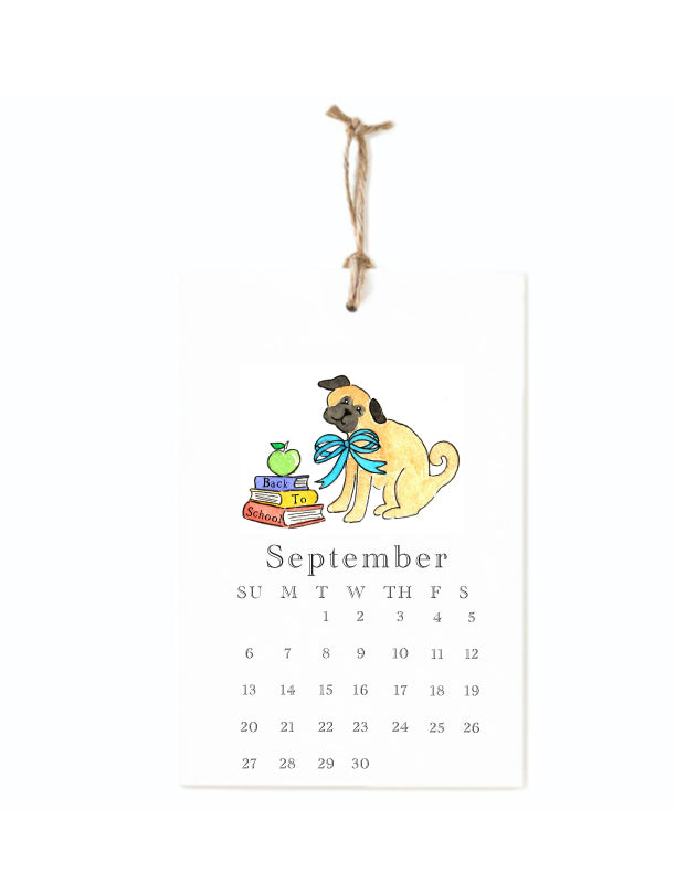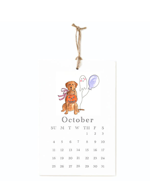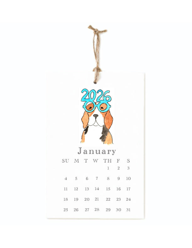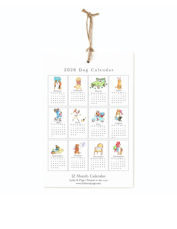 2026 Dogs Calendar features 12 unique watercolor painted dog illustrations. It fits excellently above a desk or kitchen wall. Each month contains varying dog breeds dressed seasonly and having fun in a whimsical way. Calendar is tied with twine for hanging.