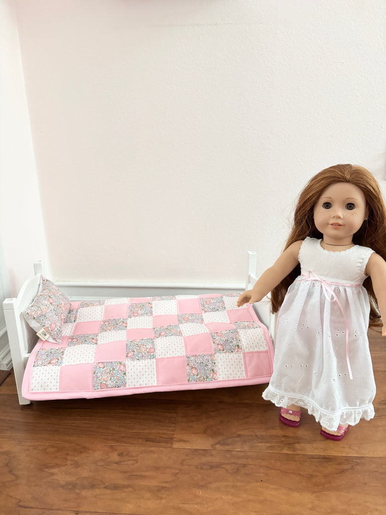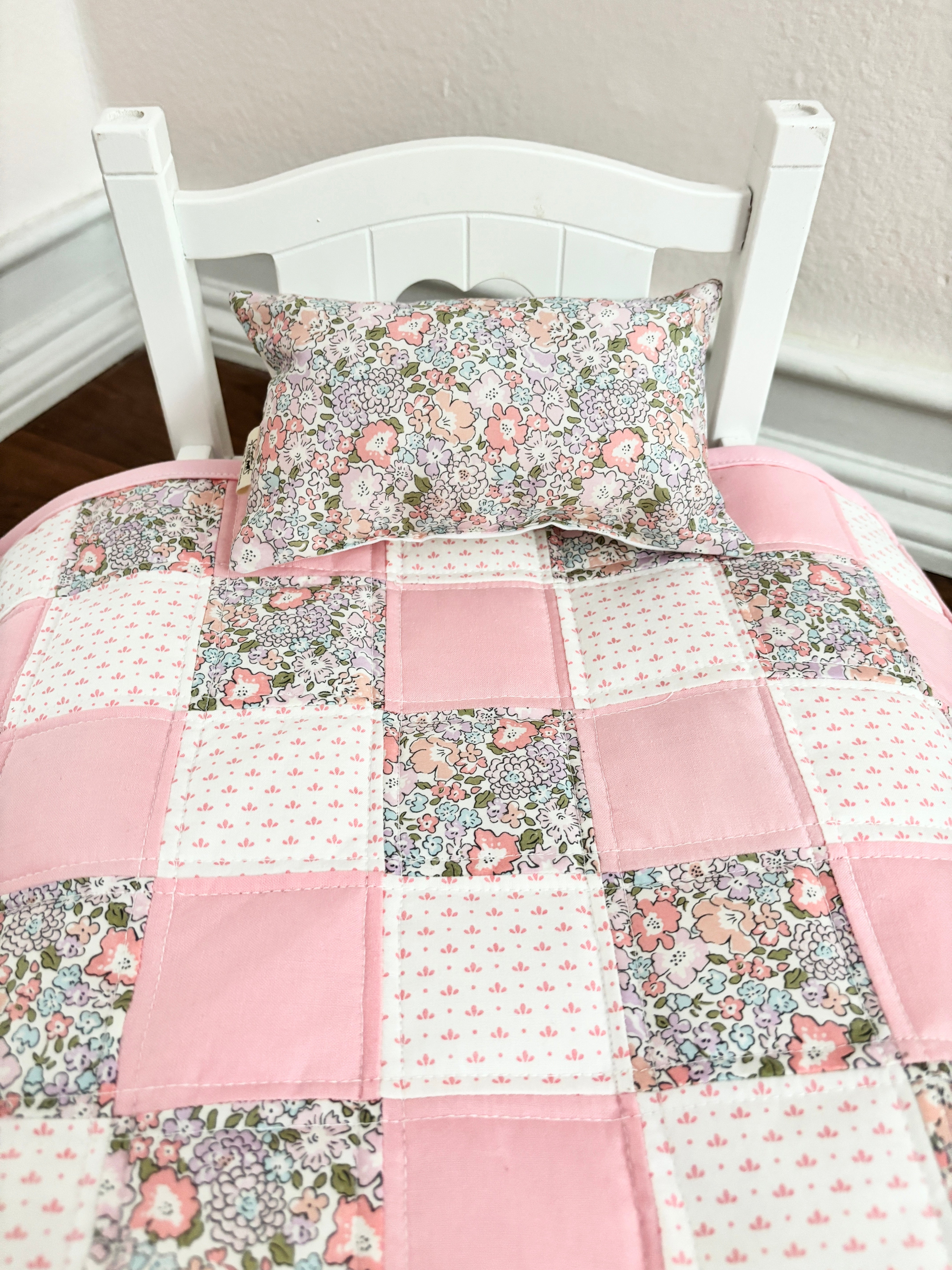This sweet little quilt is lovingly handmade featuring Michelle E Liberty light pink Liberty of London fabric. Perfectly sized for 18” American Girl dolls, stuffed animals, or as a charming accent piece, it brings a touch of vintage charm and timeless beauty to playtime or display. Each square is individually hand cut and carefully pieced together, making every quilt one-of-a-kind. The pillow matches the quilt for a coordinated set.