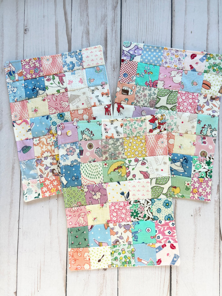 The miniature quilt measures approx. 5” x 7” and each little fabric square measures 1 inch by 1 inch.