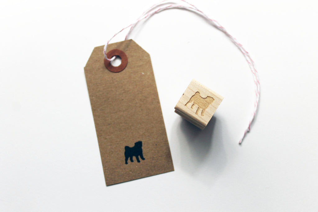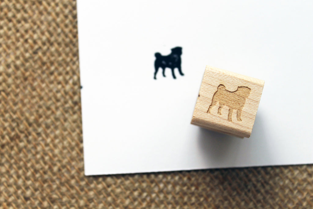 Introducing the little pug stamp! This stamp is wood mounted rubber stamp of a pug silhouette of my own design. The stamped image size is 1/2"x1/2" and the size of the stamp including the wood block is 3/4" x 3/4" x 1".