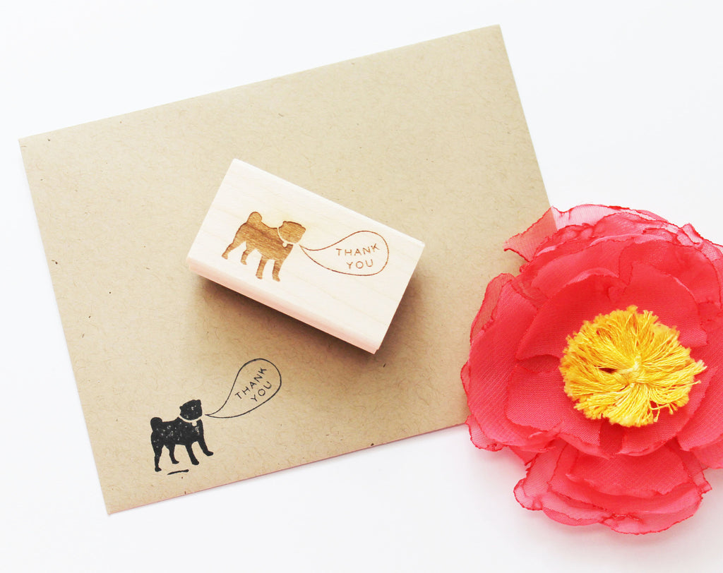 This stamp adds a special finish to any thank you note. The wood mounted rubber stamp of a pug silhouette is of my own design. The stamped image size is 1"x 2" and the size of the stamp including the wood block is 2 1/4″ x 1 1/4″ x 1″.